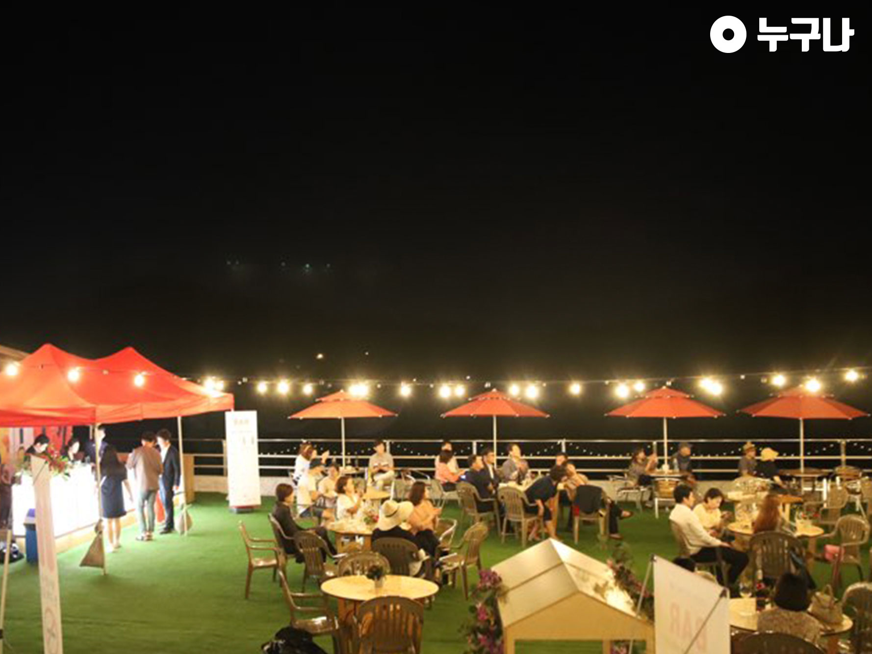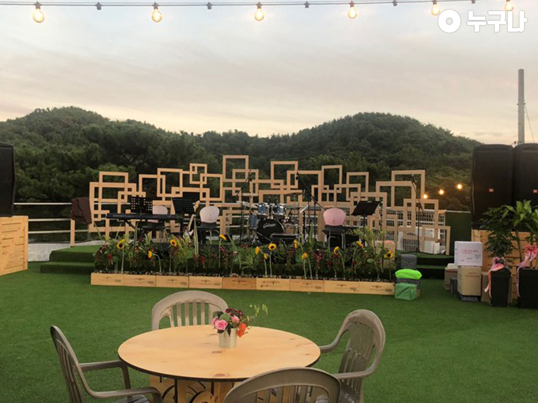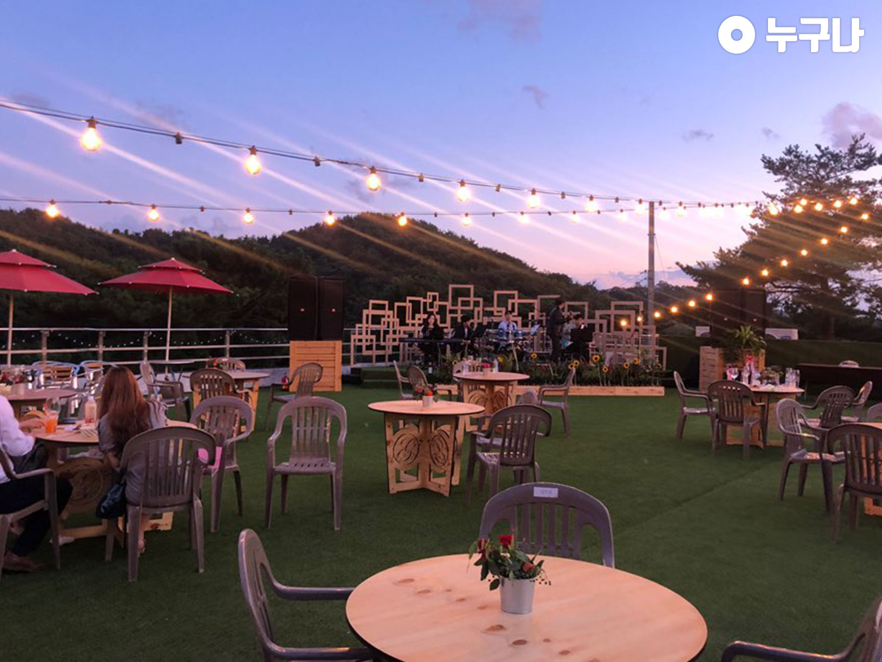 위로 조금만 올라가면 인조잔디와 파라솔 등 예쁜 조명이 설치되어 있었는데요! 위에쪽이 메인이었습니다~