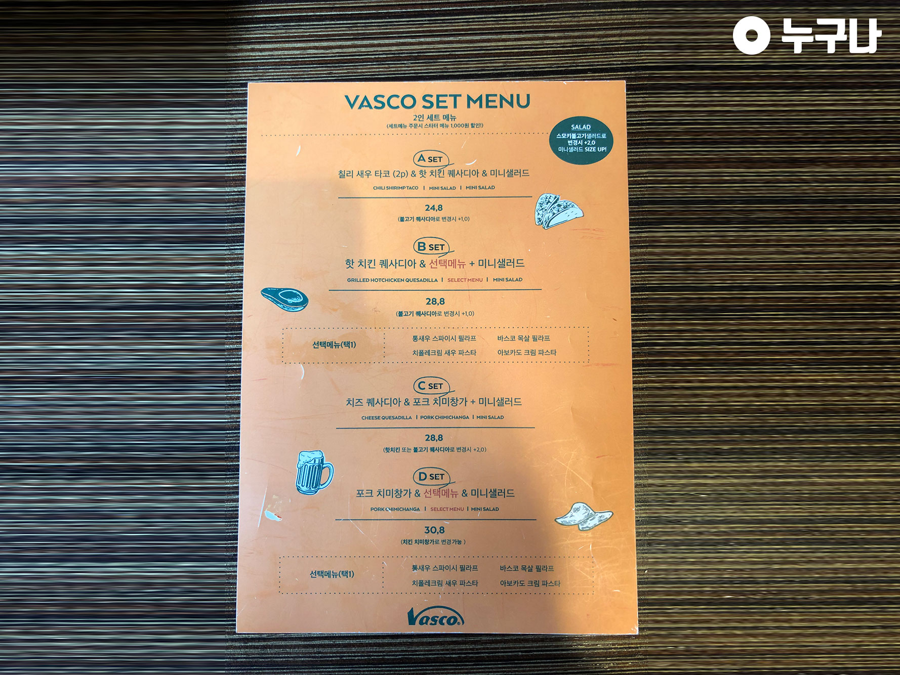 바스코 메뉴판입니다. 세트메뉴와 단품메뉴로 나눠져 있습니다.