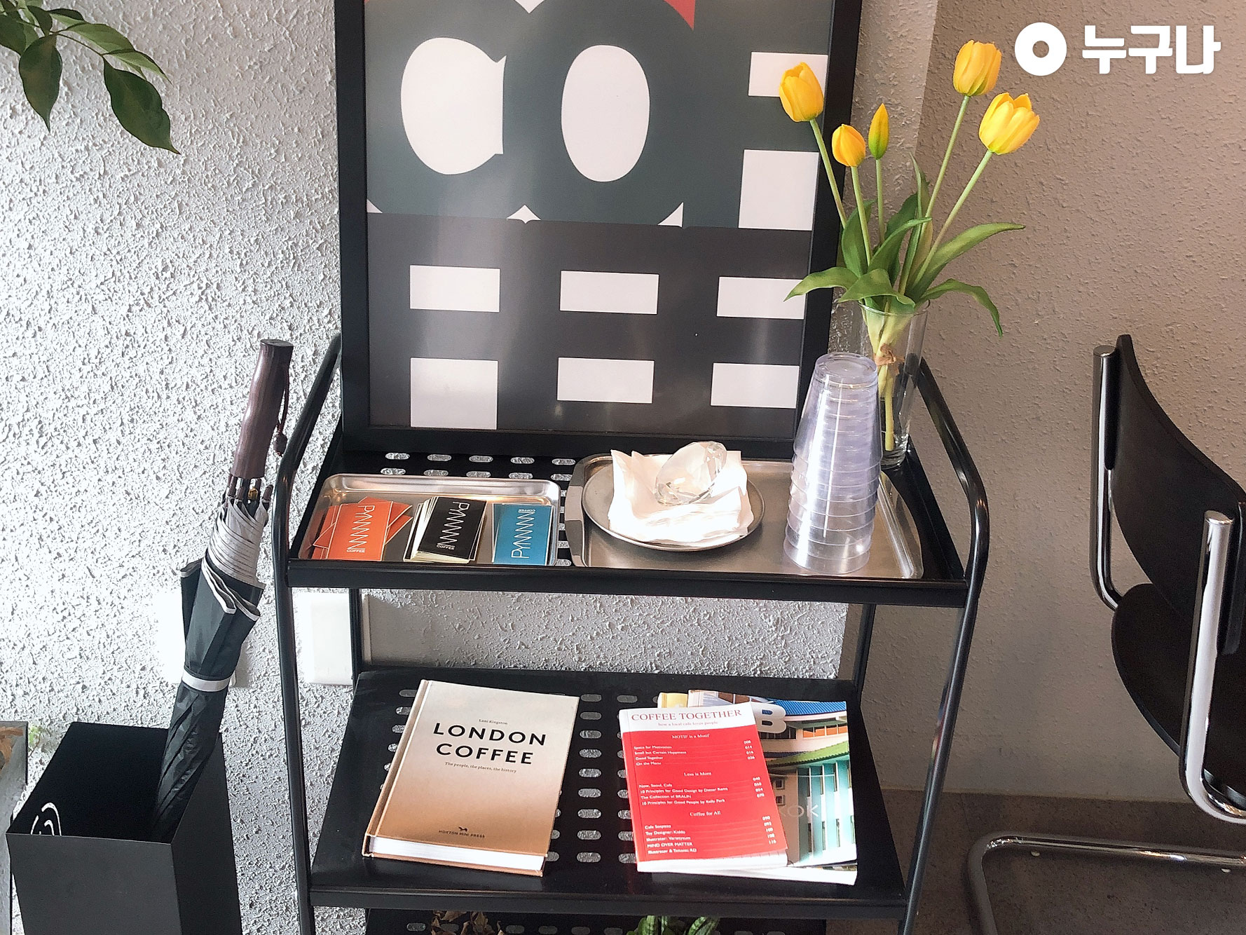 셀프바에는 컵과 핀커피 스티커 와 책이 있습니다.