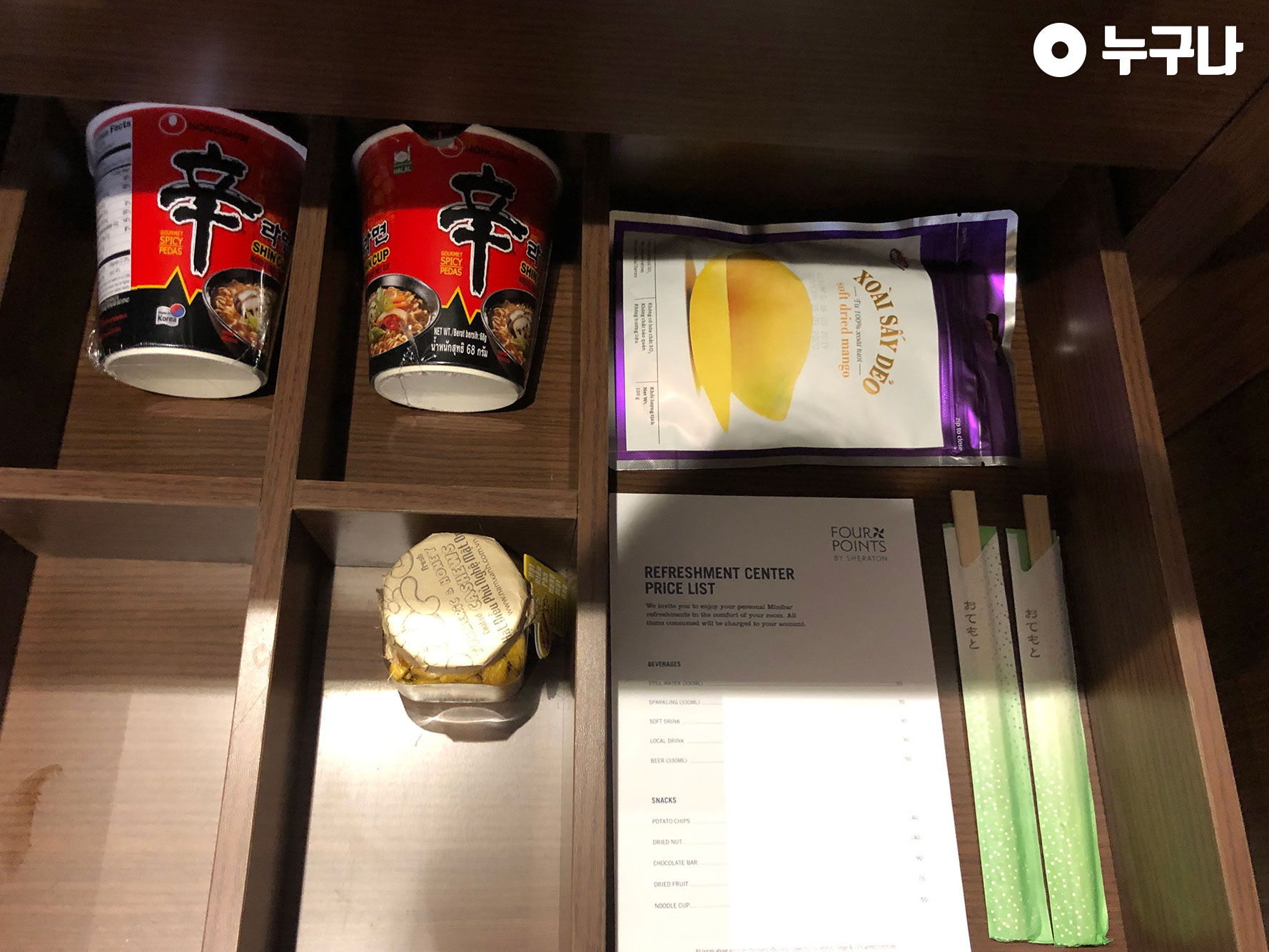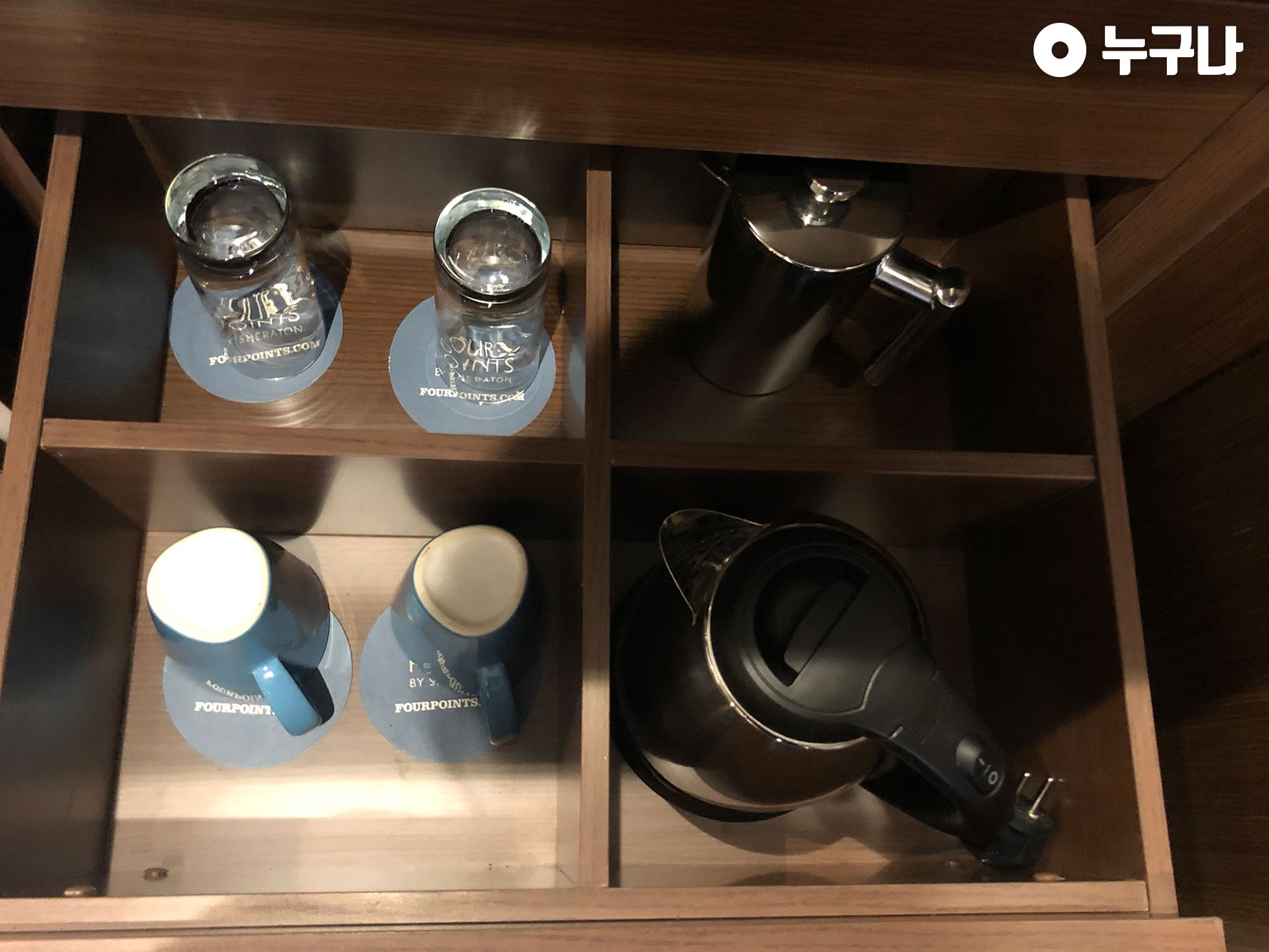 서랍에는 신라면, 컵, 커피포트, 차 등등 있는데요.