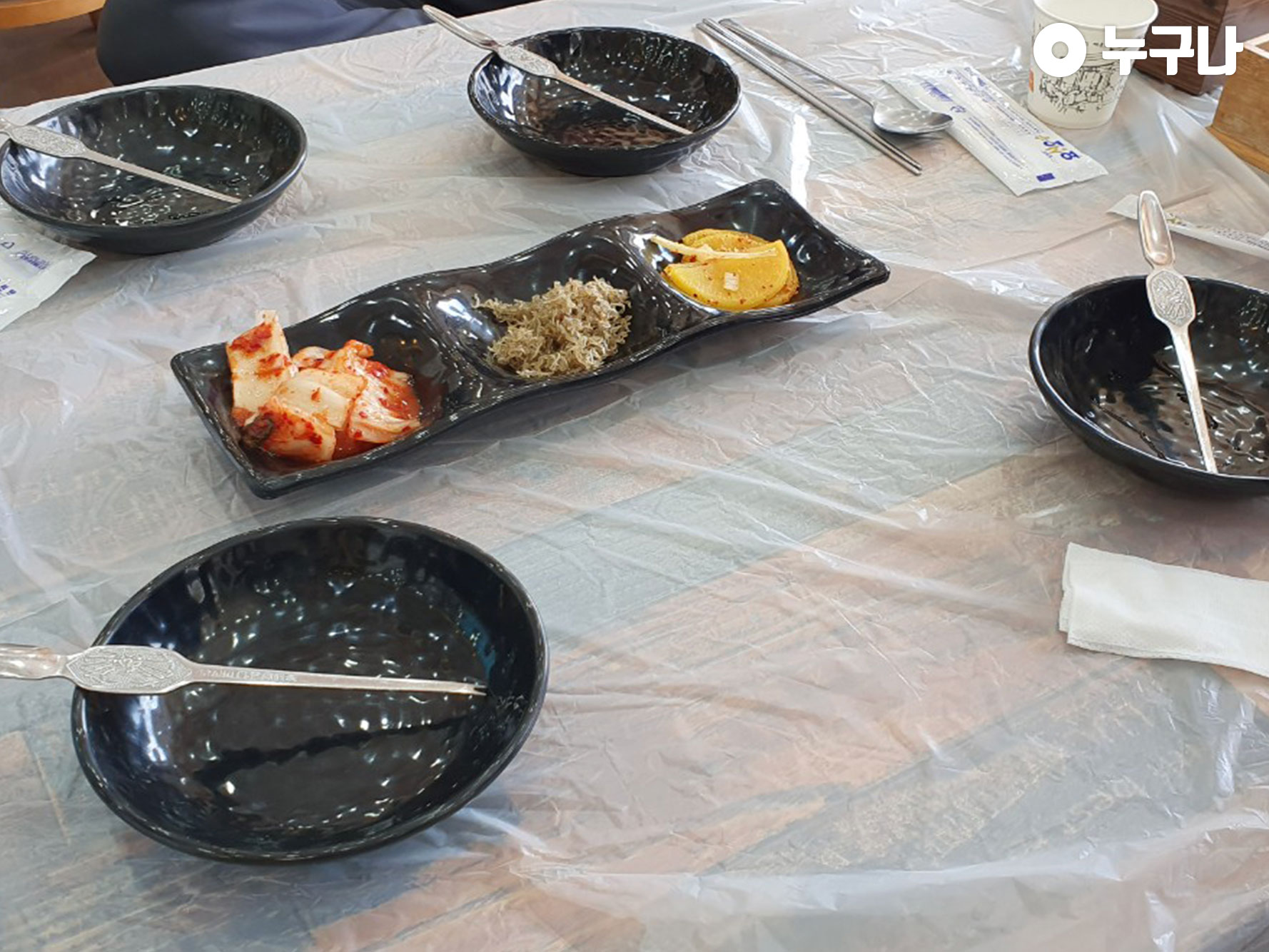 반찬은 김치, 멸치, 단무지만 나옵니다.