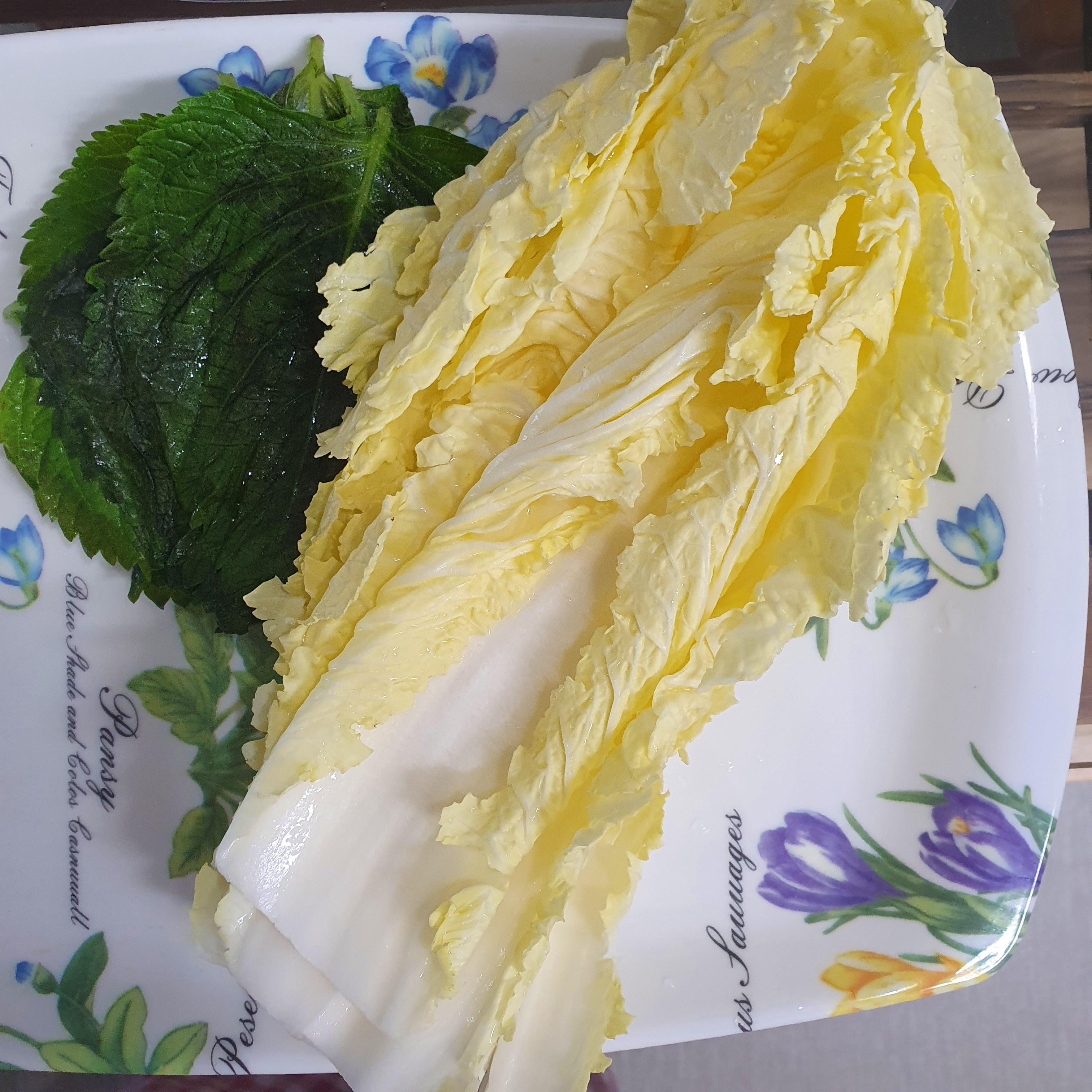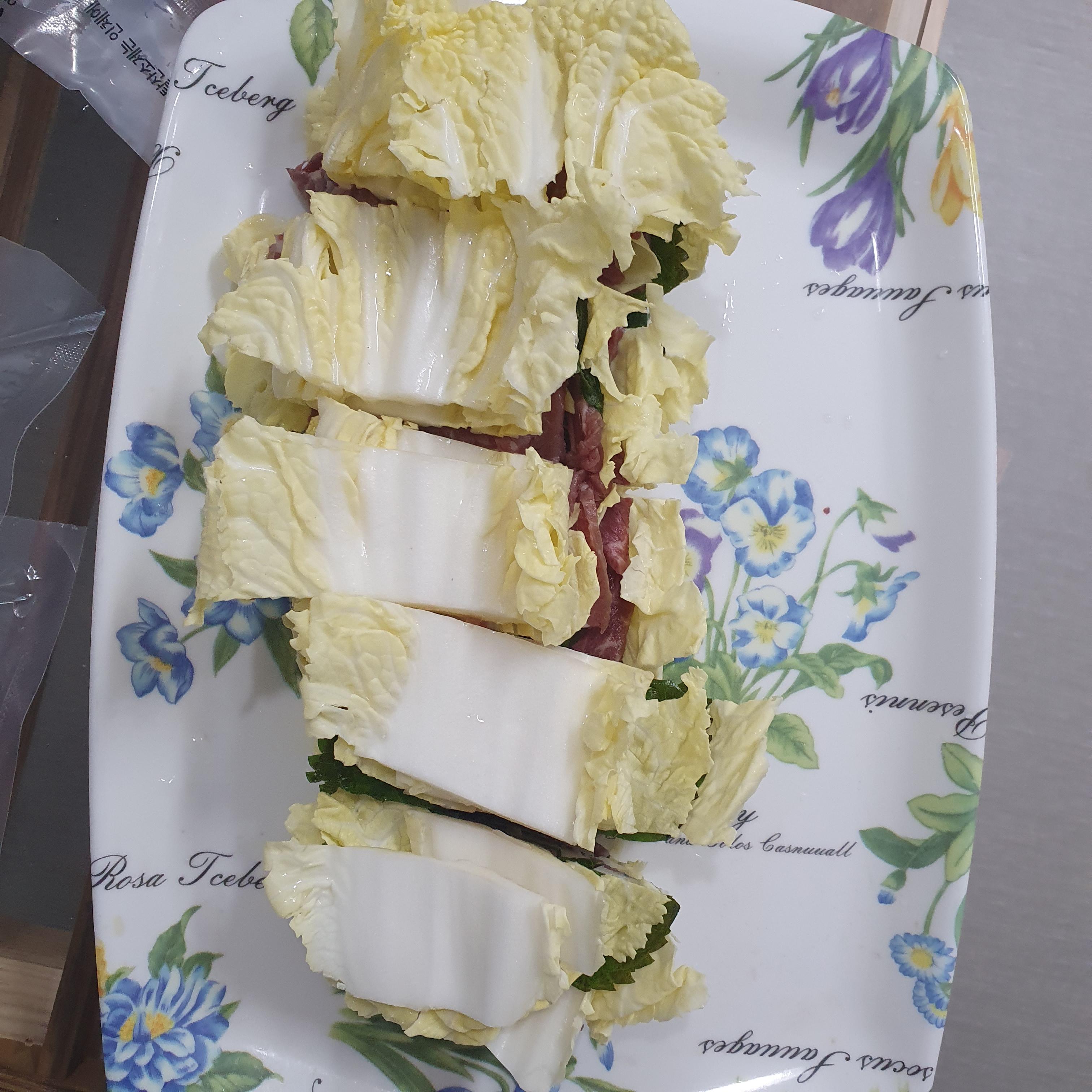 이제 도마위에서 배추, 깻잎, 소고기 순으로 쌓아서 올려준 후